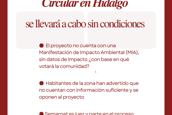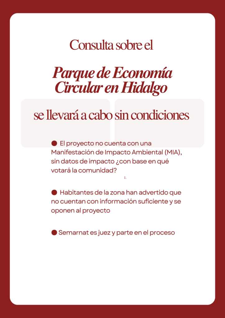 ● El proyecto no cuenta con una Manifestación de ImpactoAmbiental (MIA), sin datos de impacto ¿con base en qué votará la comunidad?● Habitantes de la zona han advertido que no cuentan coninformación suficiente y se oponen al proyecto● Semarnat es juez y parte en el proceso