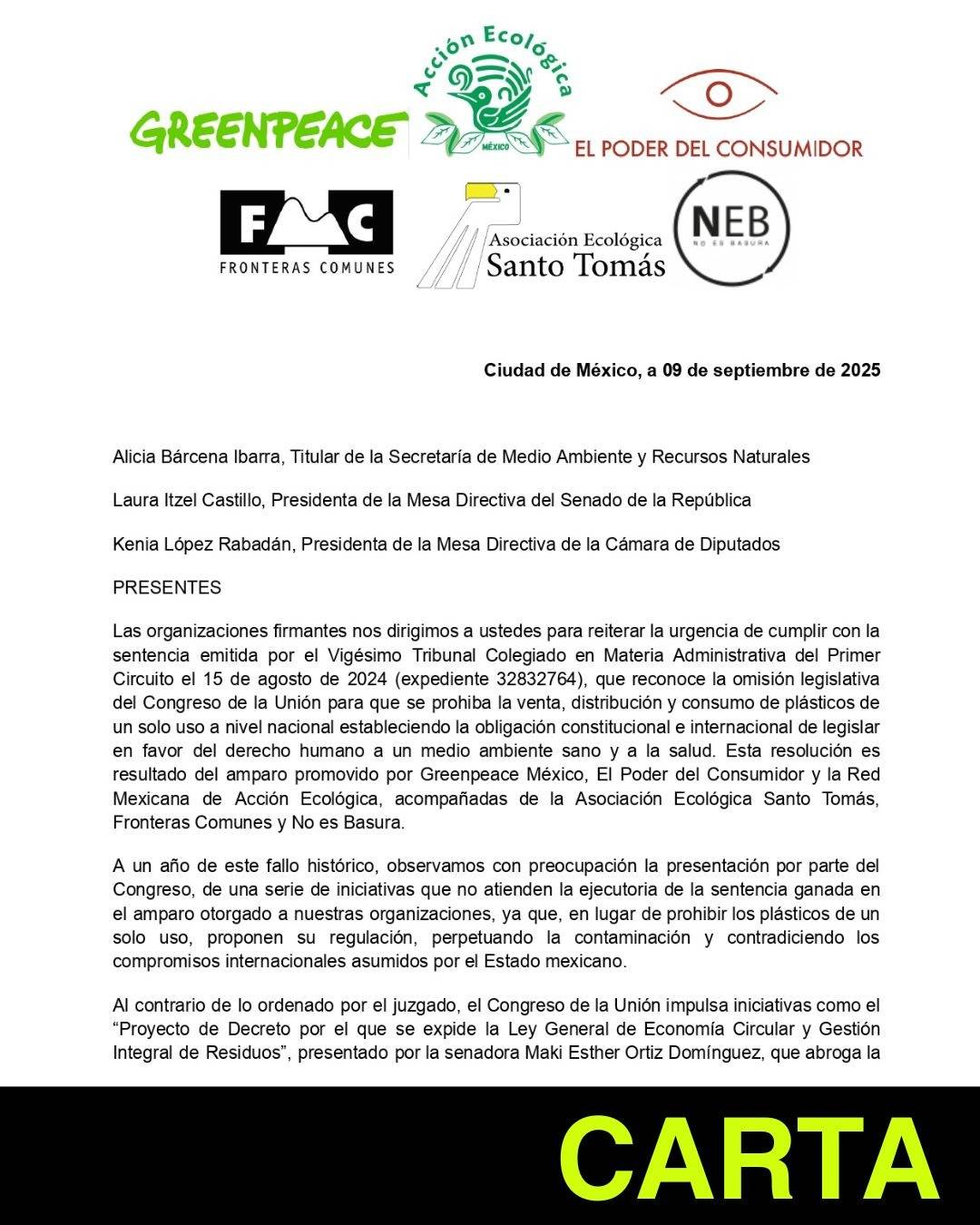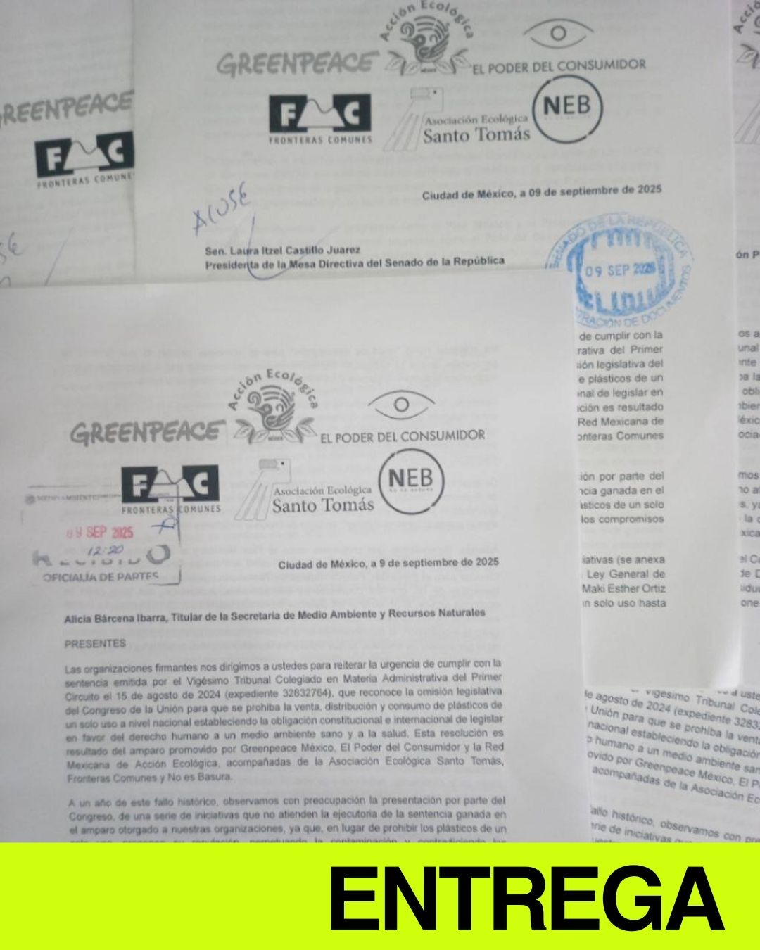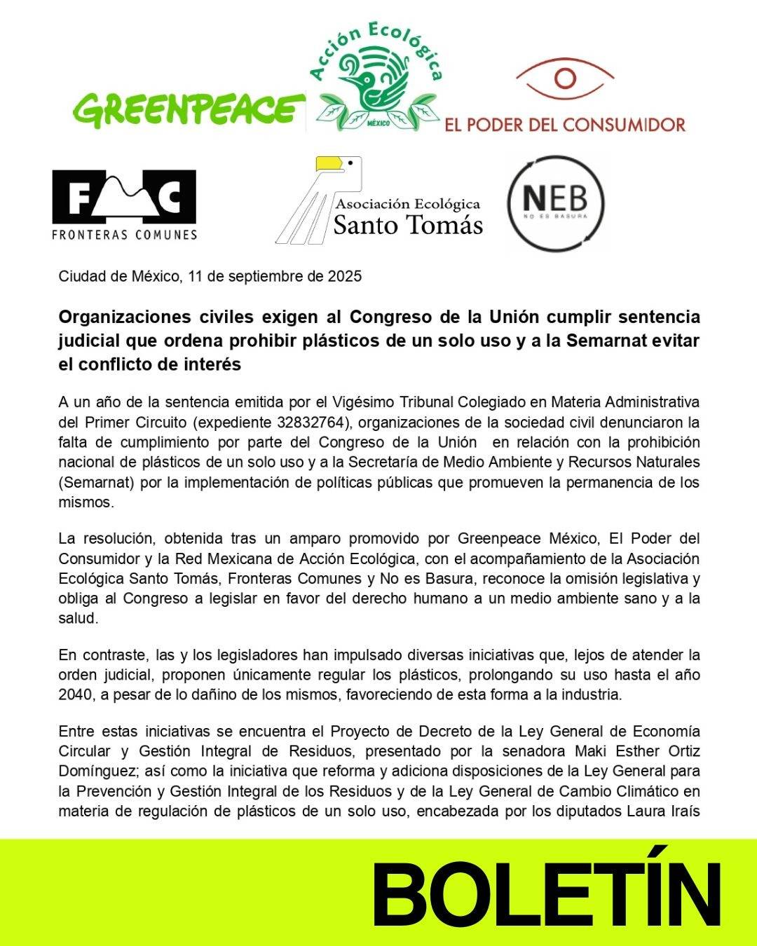 Organizaciones civiles exigen al congreso de la Unión cumplir la sentencia judicial que ordena prohibir plásticos de un solo uso y a SEMARNAT evitar conflictos de interés.